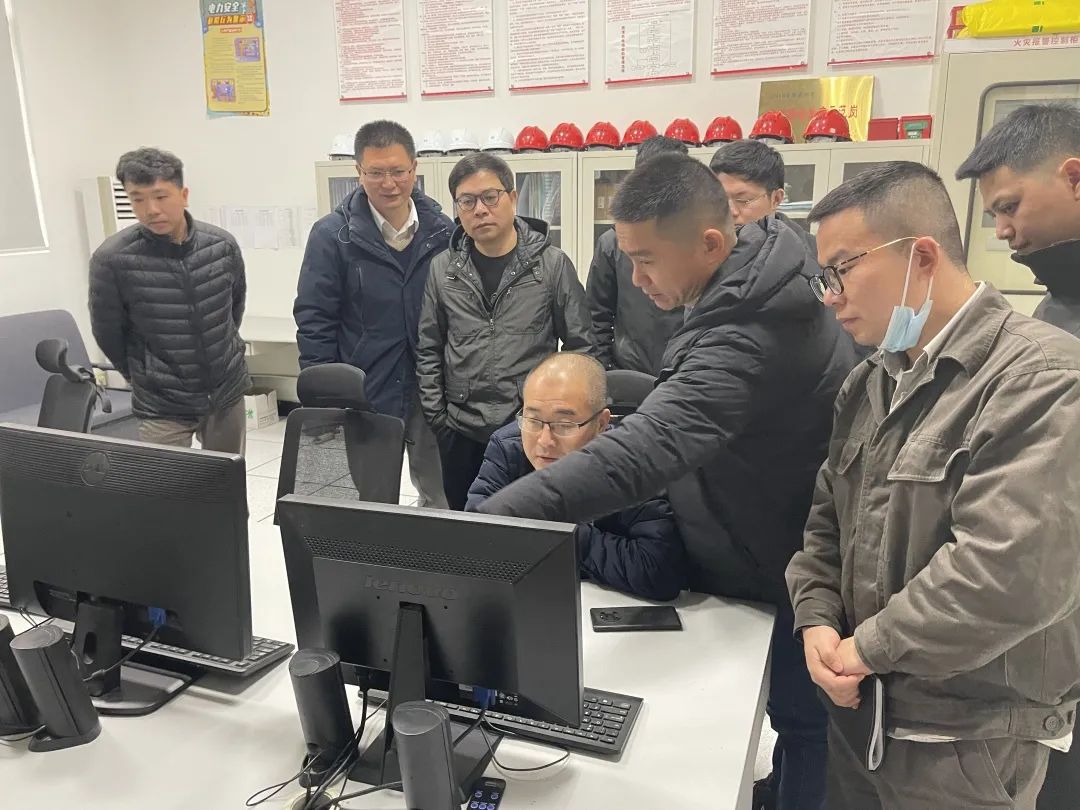 检查组一行首先来到风电场中控室,通过风光一体化监测系统了解风电、光伏新能源项目的相关运行数据及运营情况。